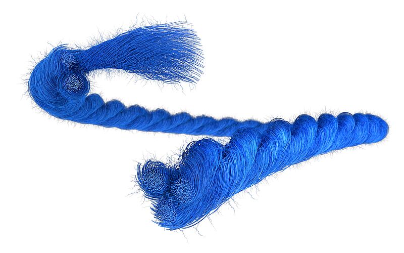 While natural fibres are available as staple fibres (limited length), synthetic raw materials can be used to produce cut staple fibres and staple fibres (schappe). In the case of staple fibres, the filaments are stretched lengthwise and break at their weak points. This results in fibres of varying lengths (20 to 70 mm) with tapered fibre ends. Spun threads have a relatively smooth thread surface. In the case of cut staple fibres, the filaments are cut into pieces of equal length (e.g. approx. 40 mm, based on the model of high-quality cotton).