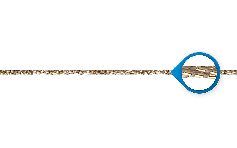 This is the classic construction for metallic embroidery and sewing threads. A continuous filament core (polyester, polyamide) is wrapped with a band of metallic foil made of metallised polyester to create the characteristic sheen. In the embroidery thread sector, single yarns are used to create a filigree look.