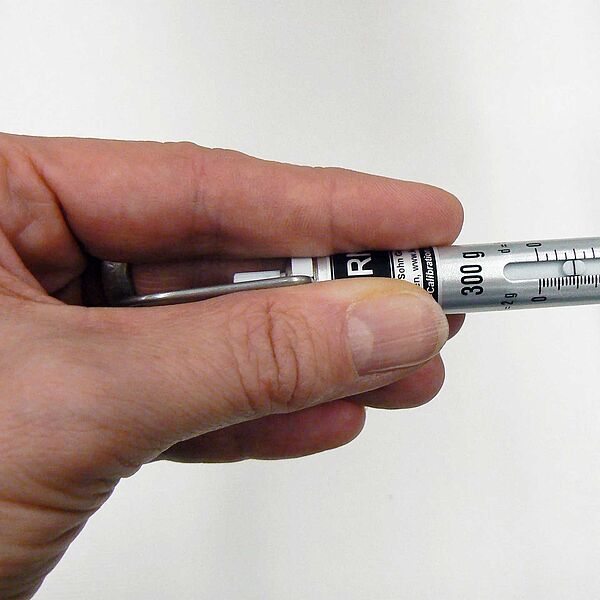 The thread is then secured in the measuring device clamp and pulled horizontally at the height of the take-up lever. The current needle thread tension can be read in cN during this movement.