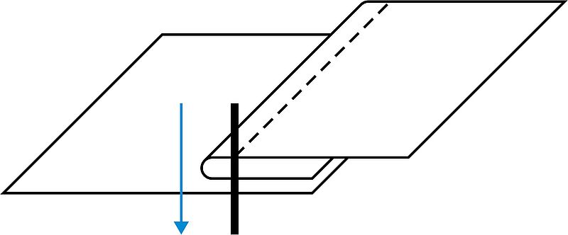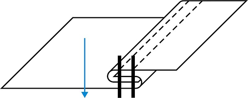 Another criterion for seam impermeability is the stitch type. This is decisive for sealing the stitch hole. The double lockstitch (stitch type 301 according to ISO 4915) is particularly well suited for water-repellent seams, as the stitch interlocking of the needle and bobbin thread occurs in the middle of the fabric. This fills the stitch hole optimally, as shown in the following sketch.